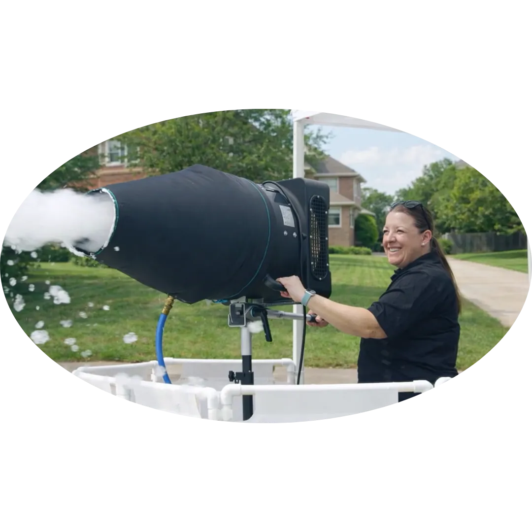 You pick up the equipment from our Denton warehouse, we show you how to use it, & you run the foam whenever you want during your event. Your rental includes enough solution for 2+ hours of continuous foam production.